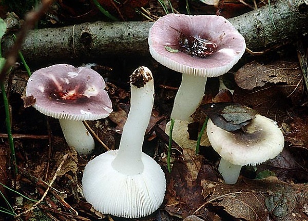- Пурпурно смеђа руссула... Можете их разликовати од брезе по специфичном мирису, који подсећа на онај који имају бурмутица или табакера. Њихов прах од спора је окер, укус капица је непријатно горак. Млади плодови имају лила-црвени тон.