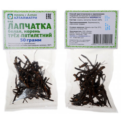 Заједно са неким другим биљкама, пажњу научника привукла је бела петељка. Избор за ову биљку није био случајан. Чињеница је да је корен белог цинкуефоил-а већ дуго показао своју моћ у лечењу штитне жлезде. Биљне сировине садрже анионе јодне киселине и елементарни јод, као и повећан садржај хемијских елемената Зн, Мн, Си, Ал.