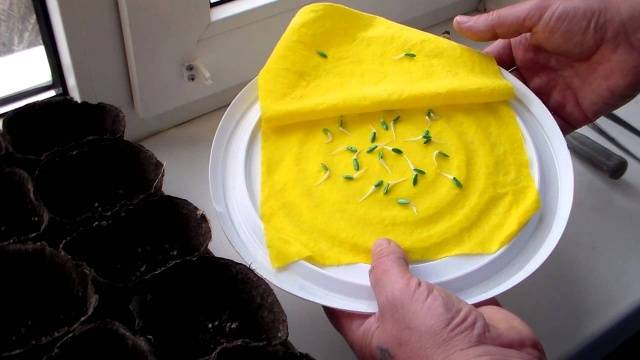 - Семе се стављају на газу навлажену водом, покривену филмом или поклопцем и остављају на топлом месту 2-3 дана. Собна температура треба да буде 25-28 степени (можете ставити семе на батерију).