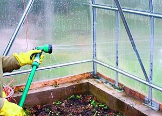 Није тајна да чак и мраз не убија споре гљивица у тлу и на површини стакленика. Као превентивну меру можете користити калијум перманганат. За обраду зидова и плафона стакленика биће потребно засићено решење. Калијум перманганат се разблажи у скоро кључалој води и прска по целој површини стакленика, не занемарујући никакве пукотине. Одмах се земљиште сипа раствором вруће ружичасте боје. Након тога стаклена башта затвори чврсто.