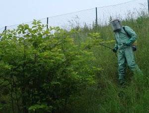 - Прскање корова млевеним хербицидом врши се у заштитној одећи. На лицу би требала бити маска или респиратор, наочаре на очима. Заштитите руке гуменим рукавицама.