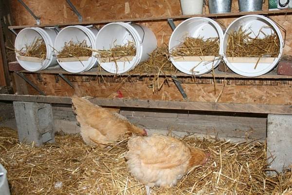 - За пет пилића довољна су два гнезда. Израђени су на шаркама, причвршћујући се на задњи зид кокошињца. Изван куће можете проћи кроз прозоре насупрот сваког гнезда и затворити их кутијама са поклопцем на шаркама. Овај дизајн ће олакшати сакупљање јаја.