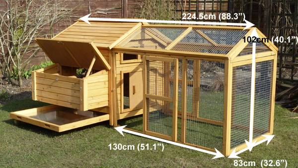 Лети ће пилићи у кући само лежати и спавати, а остатак времена проводити напољу. Да бисте спречили птицу да уђе у башту, потребно је да закачите шетњу за живину. Конструкција ограде је једноставна. Довољно је само направити оквир од стубова и преко њих навући челичну мрежу. Пилићи требају пространу шетњу. Оптимално је ако су његове димензије двоструко веће од површине кокошињца. Пример дијаграма живине са димензијама може се видети на фотографији.