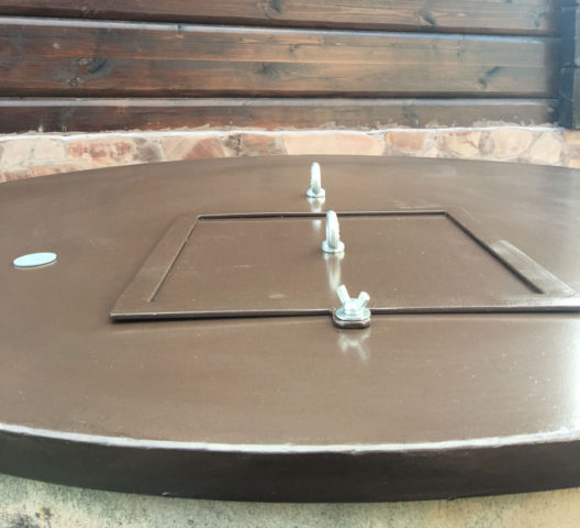 - У простор између траке и оплате налијте бетонску масу. Спојите доњи и горњи део конструкције шаркама. Причврстите металну ручку на површину текстолита. Нанети 2 слоја емајла на металне подне елементе.