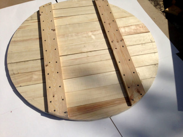- Срушите даску са дасака, трпајући их у две решетке, стављајући их близу једне друге. По дужини, требали би бити једнаки ширини штита. Трећа шипка се користи као учвршћивач, набијајући је дијагонално између две шипке на унутрашњој страни конструкције.
