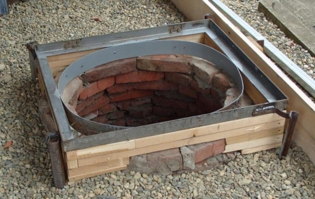 - Савијте металну траку да бисте формирали бетонску главу. Инсталирајте оплату од отпадних материјала са спољне стране главе бунара, узимајући у обзир димензије поклопца. Поправите доњи оквир на оплати, положите металну траку дуж пречника главе.
