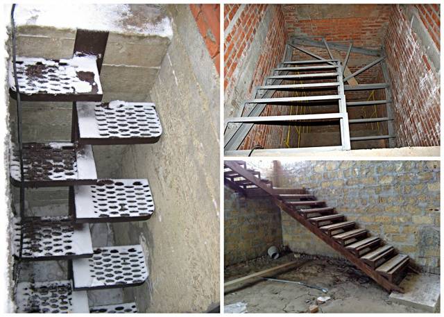 Готова метална конструкција у подруму мора бити бетонирана. Овде би већ требало унапред припремити јаму са дубином од око 200 мм. Добро је ако на његово дно ставите комад армиранобетонске плоче како бисте сигурно подупрли степенице. Сада остаје да се доњи део конструкције напуни бетоном са рушевинама у овој јами. Горњи део мердевина је причвршћен сидрима за зид. Структура ће се показати тешком, стога је боље инсталирати два носача из цеви или канала, подржавајући горњи део степеништа, близу истог зида. На крају, степенице су обложене челичним лимом, шавови за заваривање се чисте брусилицом и фарбају металне конструкције.