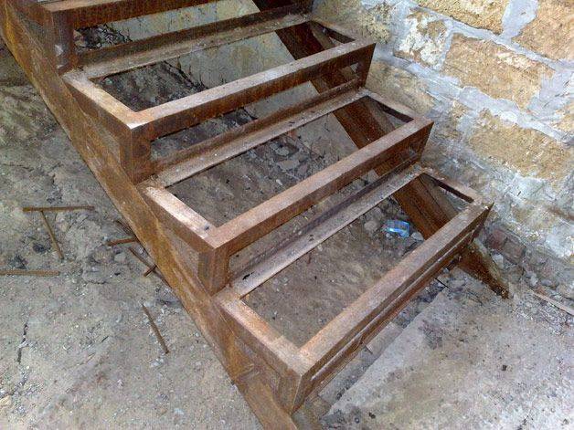 Дакле, за подножје марширајуће конструкције припремљена су два канала. Њихова процењена дужина треба да буде довољна од пода подрума, узимајући у обзир бетонирање доњег краја до ивице улазног отвора. Оквир степеница заварен је од угла са пресеком од 50 мм. За облагање је узет лим дебљине 1 мм.
