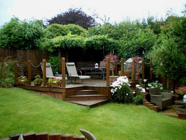 За декорацију није потребно куповати скупе предмете. Много предмета лежи у земљи и могу се користити за украшавање одморишта. Саксије од глине су погодне за саксије. Велики контејнери су постављени на под платформе, а мали контејнери са цвећем окачени су саксијама. Чак и лепа хранилица за птице направљена сопственим рукама постаће украс. Од предмета декора у продавници, погодна су баштенска ЛЕД светла. Они су окачени о дрвеће, а такође постављени дуж стаза. Скупе, али лепе вртне скулптуре створиће фантастичну атмосферу. Ако желите, можете направити мали рибњак са камењем и водопадом.