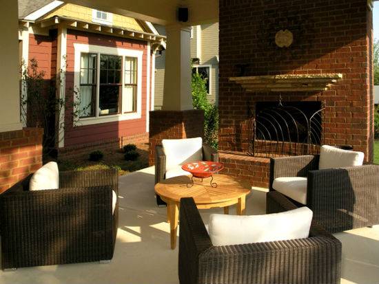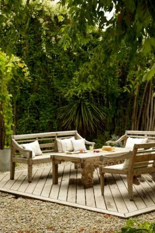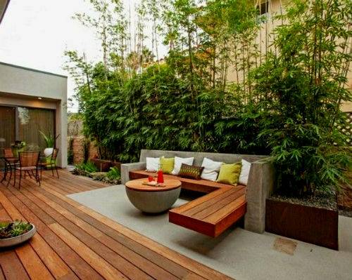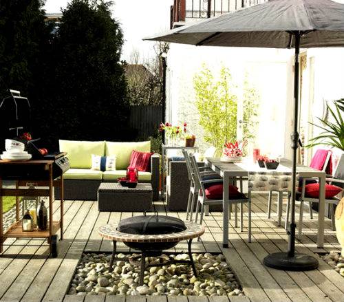 Двориште је средње величине са малим рибњаком. Изгледа прелепо украсно фонтана или обложени тобоган са камена, по коме тече вода. У близини поставите пластични или склопиви намештај и роштиљ. Двориште у којем је постављена тераса обично је ограђено високом оградом. Цвеће и грмље су посађени у близини ограде.