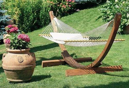Традиционално, место одмора користи се за гледање стола и столица. Зашто не би приступили организацији овог броја са друге стране? Ако дацха има неговани травњак са прелепом баштом, онда овде можете инсталирати неколико висећих мрежа и широке клупе у облику љуљашке. Додатни украс локације биће велика глинена посуда са цвећем. Такво место је савршено за опуштање и поновно спајање са природом. Маказе, сто и столице овде једноставно нису на месту.
