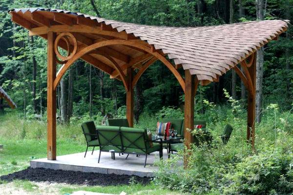 У летњим викендицама смештеним по налогу шуме, испод разгранатих стабала може се организовати идеално место за одмор. Круна ће заменити кров, али ће спасити само од сунца. Ако је дрвеће јако фолирано, постоји шанса за бег од слабе кише, али не и од јаке кише. Такво подручје испод дрвећа можете уредити само намештајем од материјала отпорних на влагу. Осим стола и клупа, овде није потребно ништа друго. Ако је потребно, са стране се може уградити преносиви роштиљ.