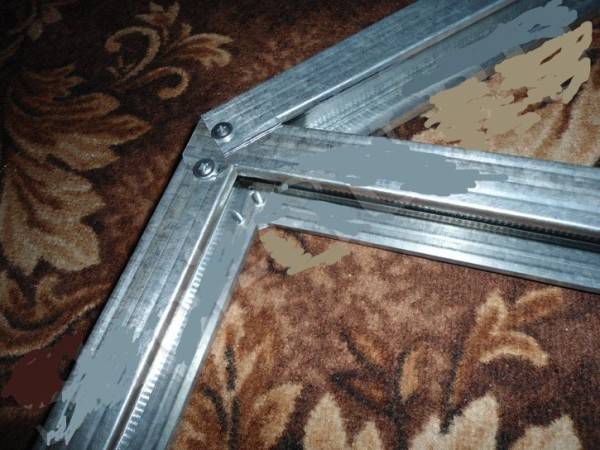- Поцинковање је прилично мекано и не захтева додатно бушење за затезање вијака. Крајеви делова оквира уметнути су један у други и једноставно повучени заједно са најмање два вијка за самопрезивање на сваком углу. Ако је оквир лабав, везе су додатно ојачане саморезним вијцима.