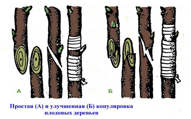 - Копулација Уобичајена је, али трауматичнија метода за подлогу. Резнице потколенице и матичног дрвета сече под оштрим углом, комбинују се и фиксирају. Пречник трупаца треба да буде приближно једнак тако да голо дрво буде што мање.