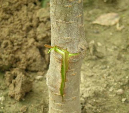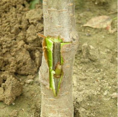 - Сечење коре или цепање - једна од најефикаснијих, али сложенијих метода.Дебло донаторског дрвета мора бити довољно дебело да поднесе оштећења и стрес. Истовремено, дрво не би требало да буде старије од 2,5 - 3 године. Предност методе је велики број одрживих пупољака који остају на изданку. Међутим, ако се калем одбије, дрво давалац обично умире.
