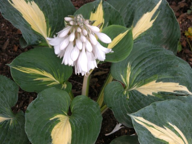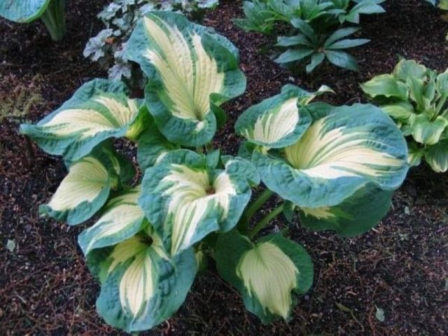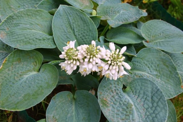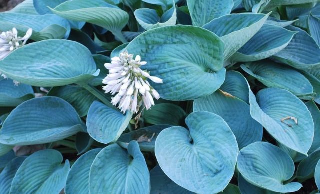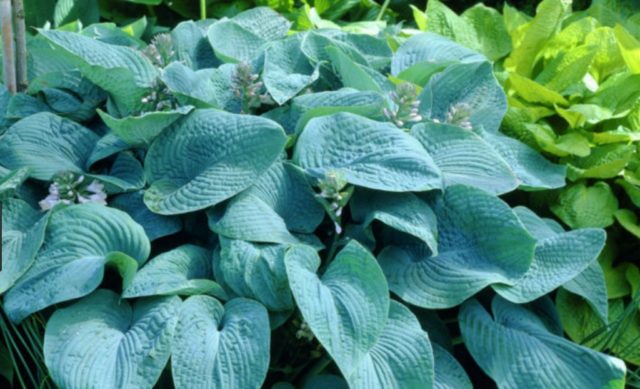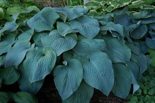 По изгледу, грм је прилично велик са широким и густим листовима. Боја им је дубоко зелена са сивим воштаним цветањем, у облику срца. Због чињенице да боја има плавкасто-сиву нијансу, биљка се назива плавим домаћинима. Површина лима је ребраста на додир, дугачка је око 30 цм, а широка до 25 цм.
