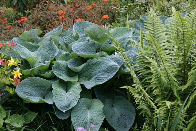 Хоста Сиеболд Елегантс у комбинацији са папратом на позадини цветних светлих биљака