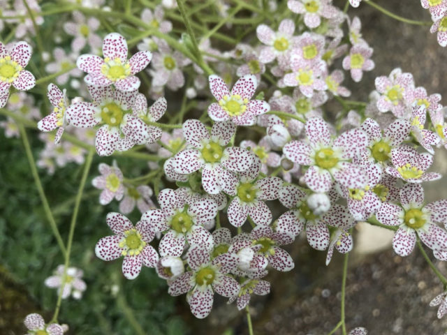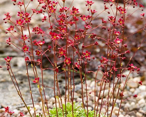Издржљива саксифрага сорте Риа почиње да производи скромне цветне стабљике у јуну