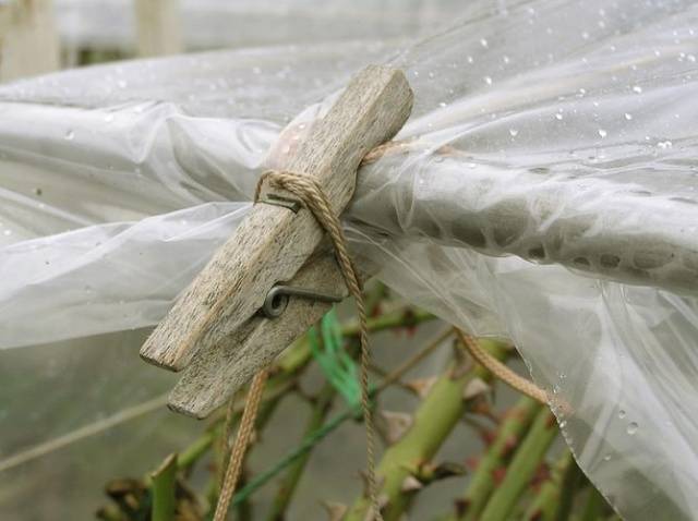 - Полиетиленски филм - најјефтинији и најпопуларнији материјал, али не дише. Због тога, припремајући руже за зиму, обавезно оставите рупе за биљке да удахну. Негативне особине пластичне фолије: не пропушта ваздух, има ограничен радни век. Позитивне особине: економска корист, способност задржавања топлоте;