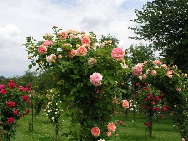 Други чланак ће вам детаљно рећи о формирању пењачких и пењачких ружа. Напомињемо да је сортама пењачицама дефинитивно потребна подршка, јер је њихов избор извршен тако да су им изданци били што дужи, флексибилни и било их је лако повезати. Само неколико сорти има јаке, не предуге изданке. Нису распоређени у другу групу само зато што цветају, попут свих пењачких ружа, на прошлогодишњим гранама.