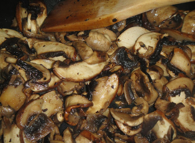 - Пржите лук док не порумени, пребаците на млечне печурке.