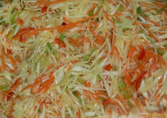 Купус се реже на било који начин на који сте навикли, шаргарепа се може лепо нарибати за корејске салате. После чишћења, бели лук се дроби или помоћу посебне дробилице, или једноставно помоћу оштрог ножа. Корен ђумбира је ољуштен и исечен на најфиније комаде. Сво припремљено поврће лагано се меша у одвојеној стакленој или емајлираној посуди.