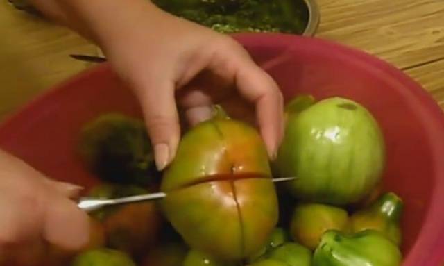 - Добро опран и осушен зелени парадајз исеците укрштено или исеците на четвртине. Све зависи од ваших жеља. Поред тога, ситно резање доприноси брзом кувању Јермена.