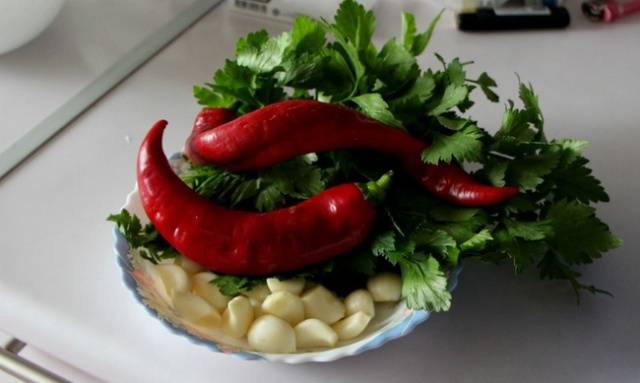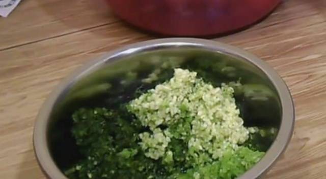 - Такође очистимо бели лук, исперимо га под млазом воде. Перемо зеленило, мењајући воду неколико пута како бисмо се решили зрна песка. Самељите бели лук помоћу пресе и ситно исецкајте зеленило, претходно уклонивши жилаве стабљике. Мешамо ове састојке, укључујући љуту паприку. Пуњење парадајза је спремно.