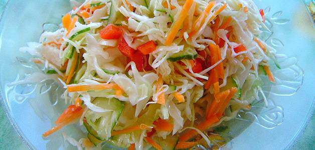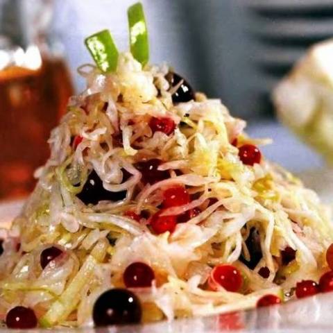 Додатак свежег краставца у укисељени купус чини ову салату посебно елегантном. Такође је украшен разнобојним тракама киселе паприке.