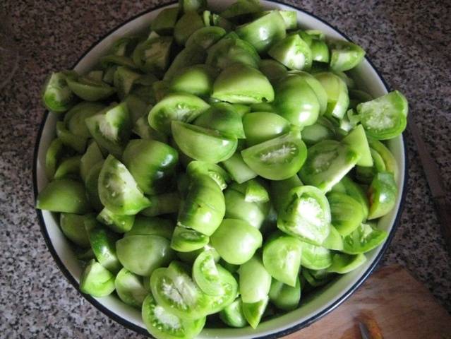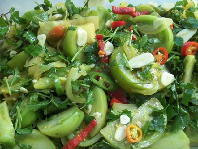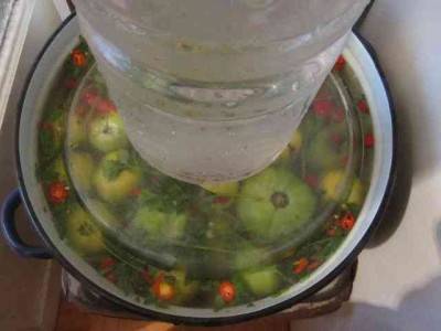 Зелени парадајз чврсто упакован у одговарајућу посуду, поређану зачинима са свих страна, прелијте хладним раствором соли и оставите у кухињи 5-6 дана. Даље, обрадак се такође мора преместити на хладно место.