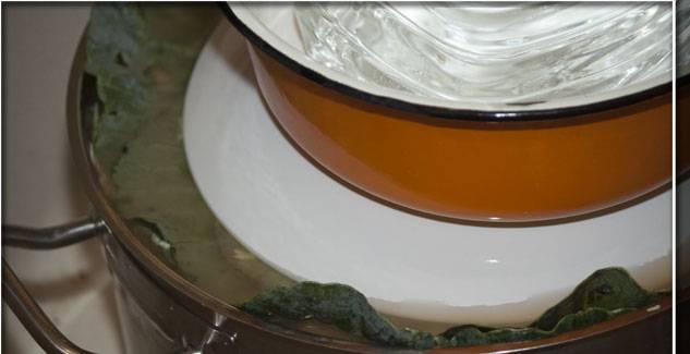 - Дно посуде покривамо слојем чистих листова купуса, лагано посипамо сољу.