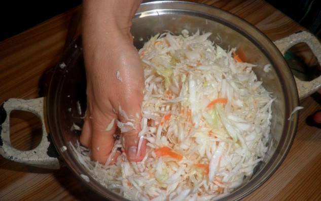 - Ставите део исецканог купуса на сто, додајте шаргарепу и поспите сољу. Добијена композиција мора се месити док се не појави сок.