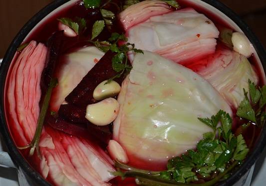 Пре свега се одликује бојом и сочношћу, захваљујући којима ово јело може украсити било који свечани сто, а да не помињемо свакодневни оброк. Али укус овог киселог купуса такође је врло необичан и добро ће доћи да диверзификује уобичајена бесквасна јела зимског стола.