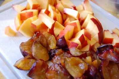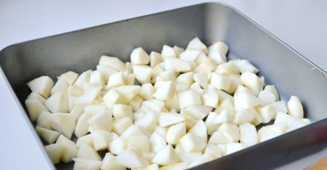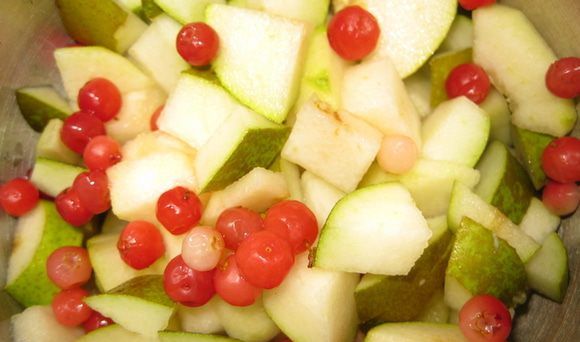 - Крушке и јабуке, ољуштене од семена, исече се на комаде и кувају 10 минута у мало воде. Охладити.