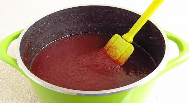 - Поново ставите умерену ватру и, доводећи воћну масу до кључања, смањите ватру и динстајте толико времена да јој се запремина преполови.