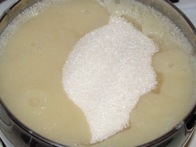 - Прво се у добијени пире додаје половина потребне количине шећера и ставља на умерену ватру.