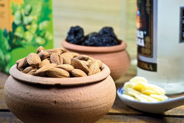- У бобицу додајте бадеме и прелијте алкохолним пићем.