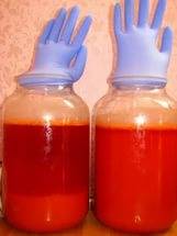 - Додајте сок у сок без пулпе бобица и поново ставите домаће вино да ферментира. Контејнер мора бити велик, тако да једна трећина контејнера није напуњена. На бочици треба да ставите рукавицу, након што прободете један од прстију иглом. Под утицајем гасова, рукавица ће се надувати, а до краја ферментације ће пасти.