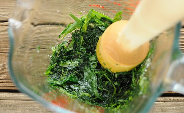 - Покријте посуду прозирном фолијом и оставите да одстоји око пола сата у фрижидеру док зелена маса не створи сок.