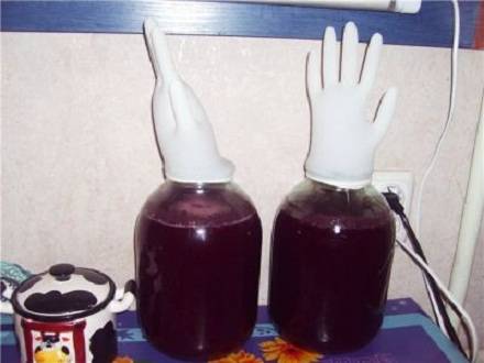 После 5 дана, филтрира се ферментирана сладовина, исцедити суве шљиве и бацити. Налијте сладовина у тегле, додајући претходно четвртину стопе шећера. Не може се допунити до врха, у супротном неће бити места за пену. Попуњавамо посуду за 3/4 запремине. Ставили смо водену заптивку или ставили пробушену медицинску рукавицу. После још 5 дана, излијте четврт литра сладовине и растворите у њој преостали шећер, сипајте назад.