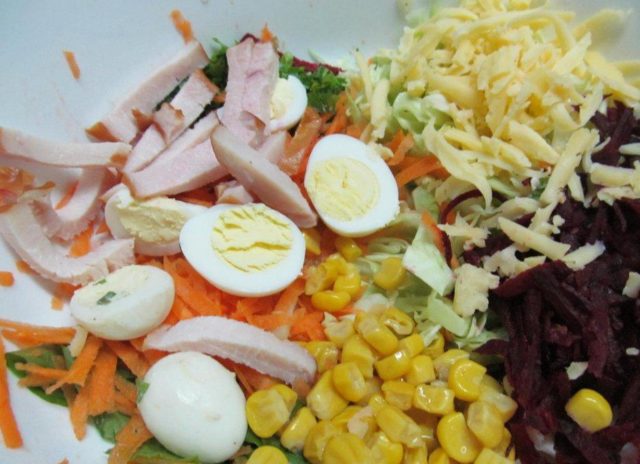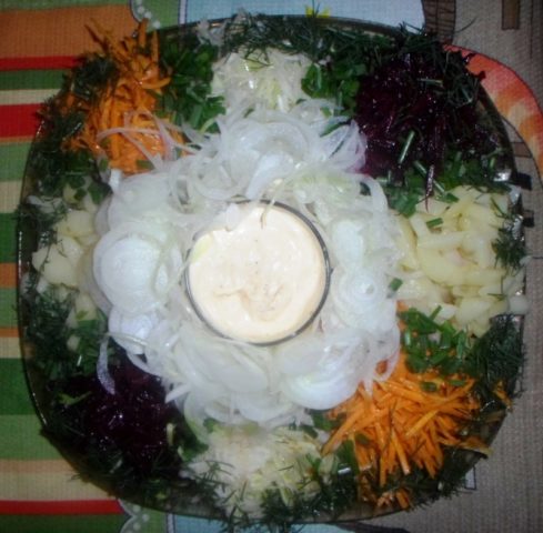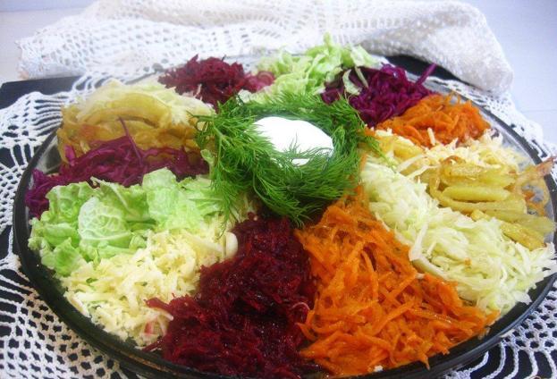 У салати се користи поврће различитих боја, које се не меша пре служења, па јело изгледа светло и необично. Принцип полагања свих састојака одвојено је већ украс.