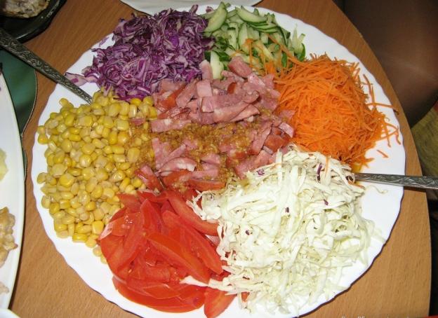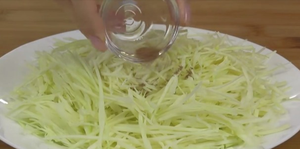 - Купус се исецка на танке траке, листови зелене салате се секу произвољно.
