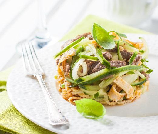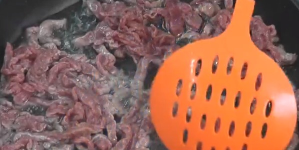 - Месо се формира у танке уске траке, пржене док не омекша.