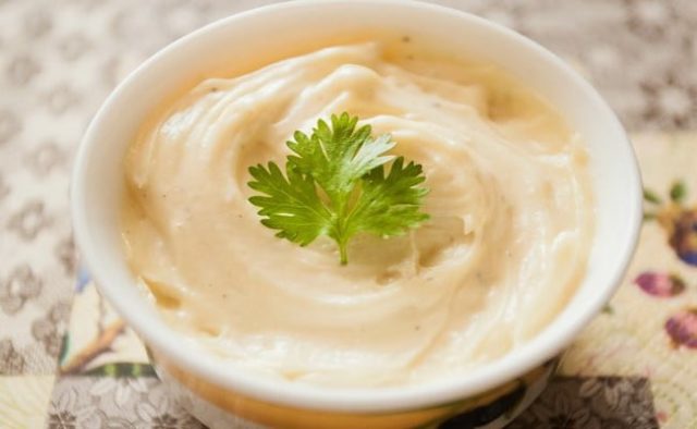 Припремите сос од мајонезе, згњеченог белог лука и млевеног белог бибера, служите одвојено. Током употребе, сви састојци се могу помешати са сосом или оставити одвојено.