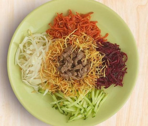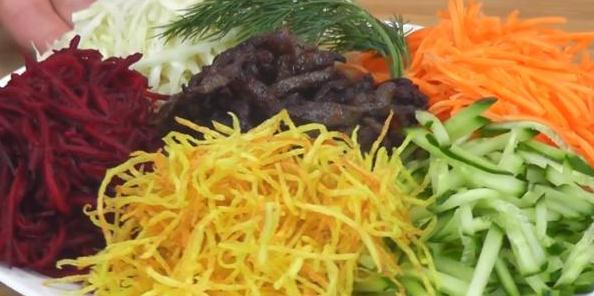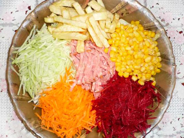 Резање поврћа и меса је руска верзија традиционалног Оливиера, само током процеса кувања производи се не кувају, већ прже. Неколико захтева: