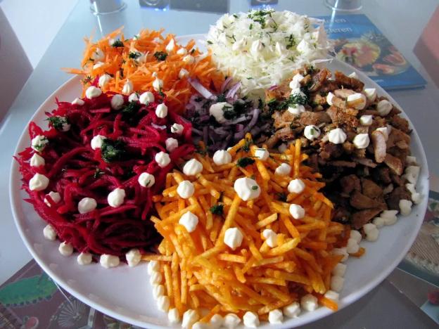 Атрактивност јелу даје осветљеност боје састојака, производи се стављају одвојено један од другог у гомилу, салата се не меша