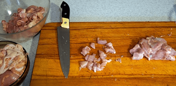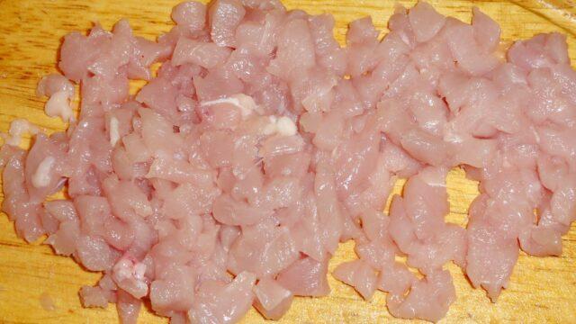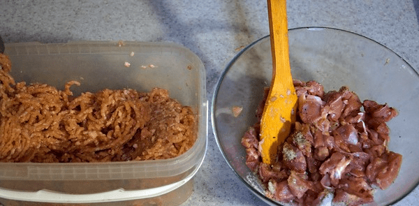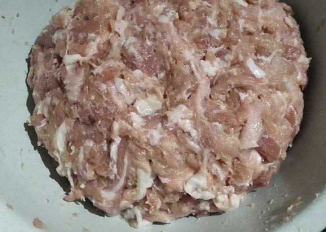 - Обично месо исеците на мале коцкице (1-2 цм), а бело месо два пута кроз млин за месо, постављајући роштиљ са најмањим ћелијама. Сам комбајн такође треба хладити.