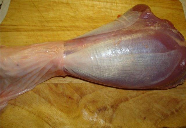 - Скините кожу са ногу "чарапом". Исеците кост што је могуће ближе врху, остављајући "кесу".
