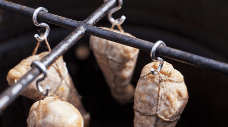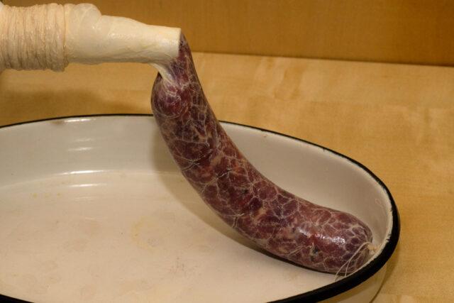 - Да би млевено месо стекло потребну густину, шкољке куване димљене кобасице пуњене њиме суспендују се 2-3 дана, дајући му време да се „смањи“.