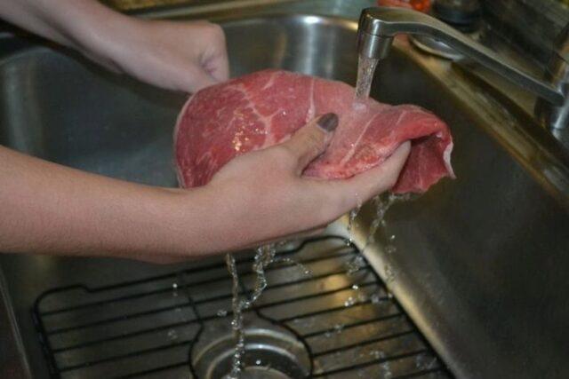 - Оперите месо у хладној текућој води, осушите, пошаљите га у замрзивач 20-30 минута да спусти температуру на 10 ° Ц.